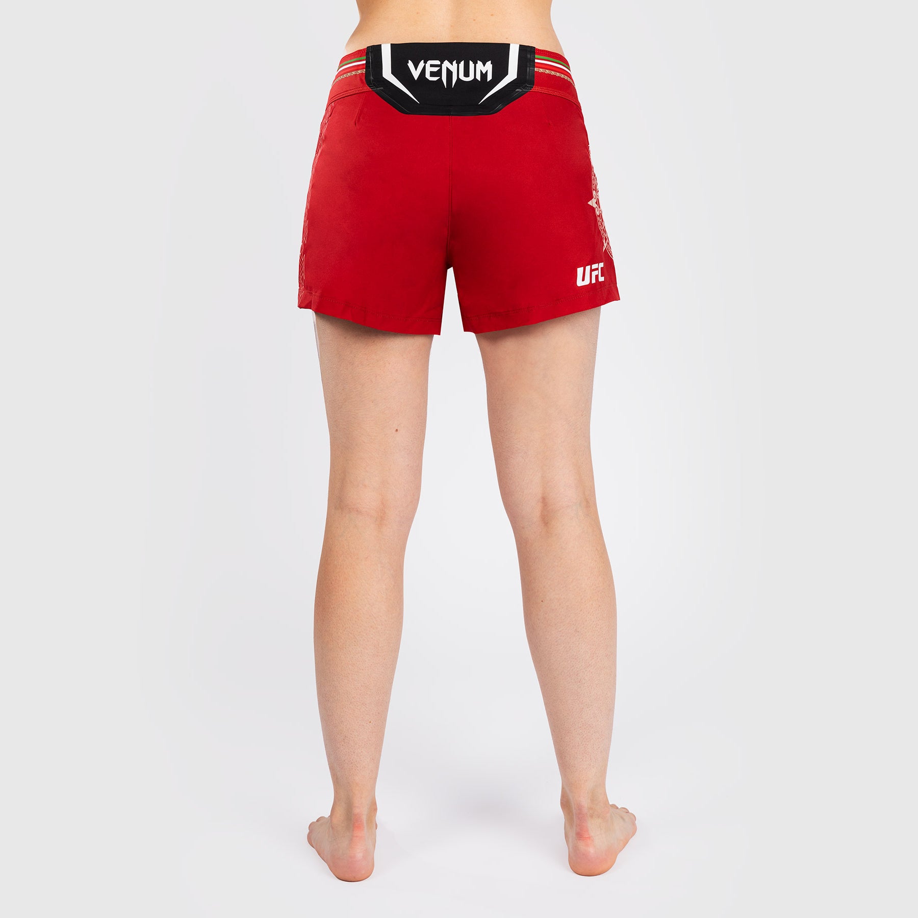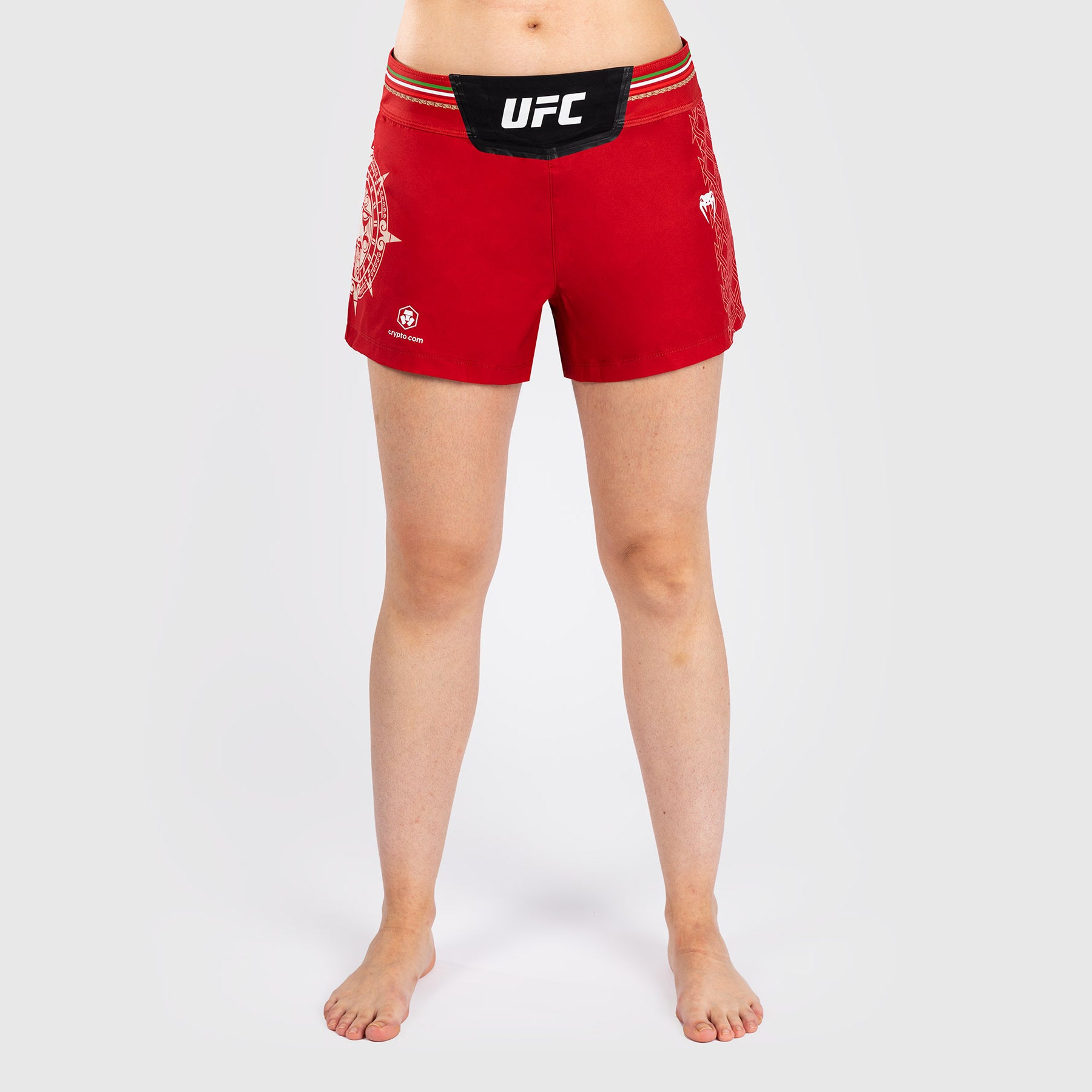 The Noche UFC by Venum Authentic Fight Night Women’s Fight Short in Red features the graphic of a sun stone, showcasing the intricate headdress Tōnatiuh, the Aztec deity of day and night.