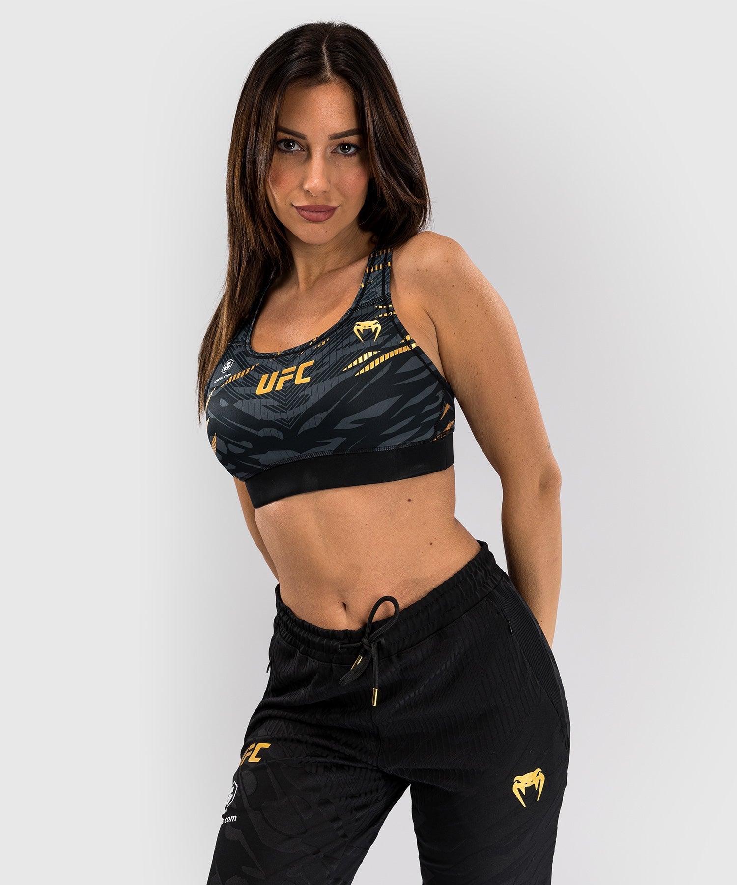 The UFC Fusion by Venum Authentic Fight Night Women’s Sports Bra is suitable for cardio, lifting and sparring. The elasticated band is supportive, while the racer-back cut ensures freedom of movement. This black/gold colorway is reserved for UFC champions.