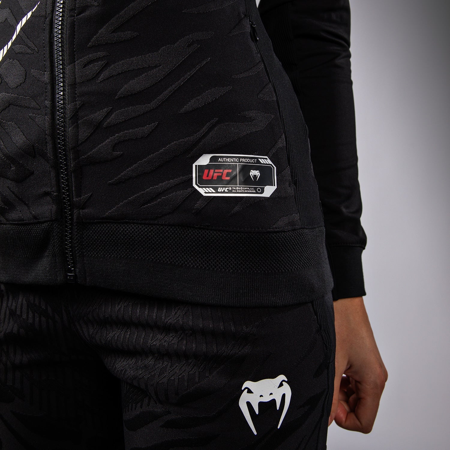 The UFC Fusion by Venum Authentic Fight Night Women’s Walkout Hoodie features two zippered pockets, plus a mesh-lined hood with adjustable drawstrings. The wrists and inner panel of the arms are made with a premium stretch fabric, to allow athletes to take off their hoodies without removing their gloves.