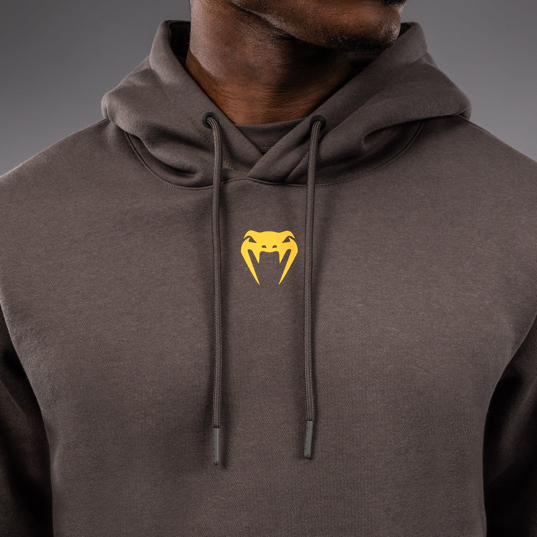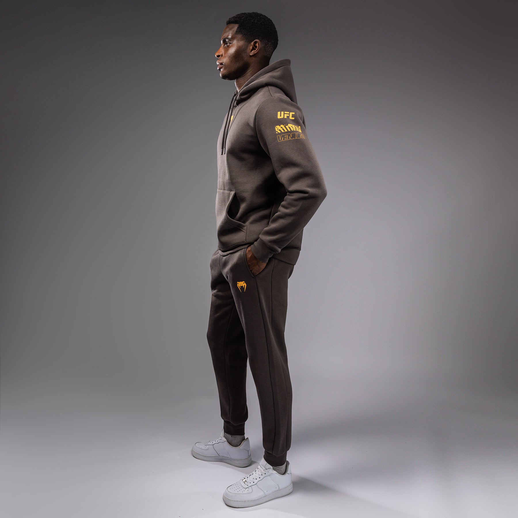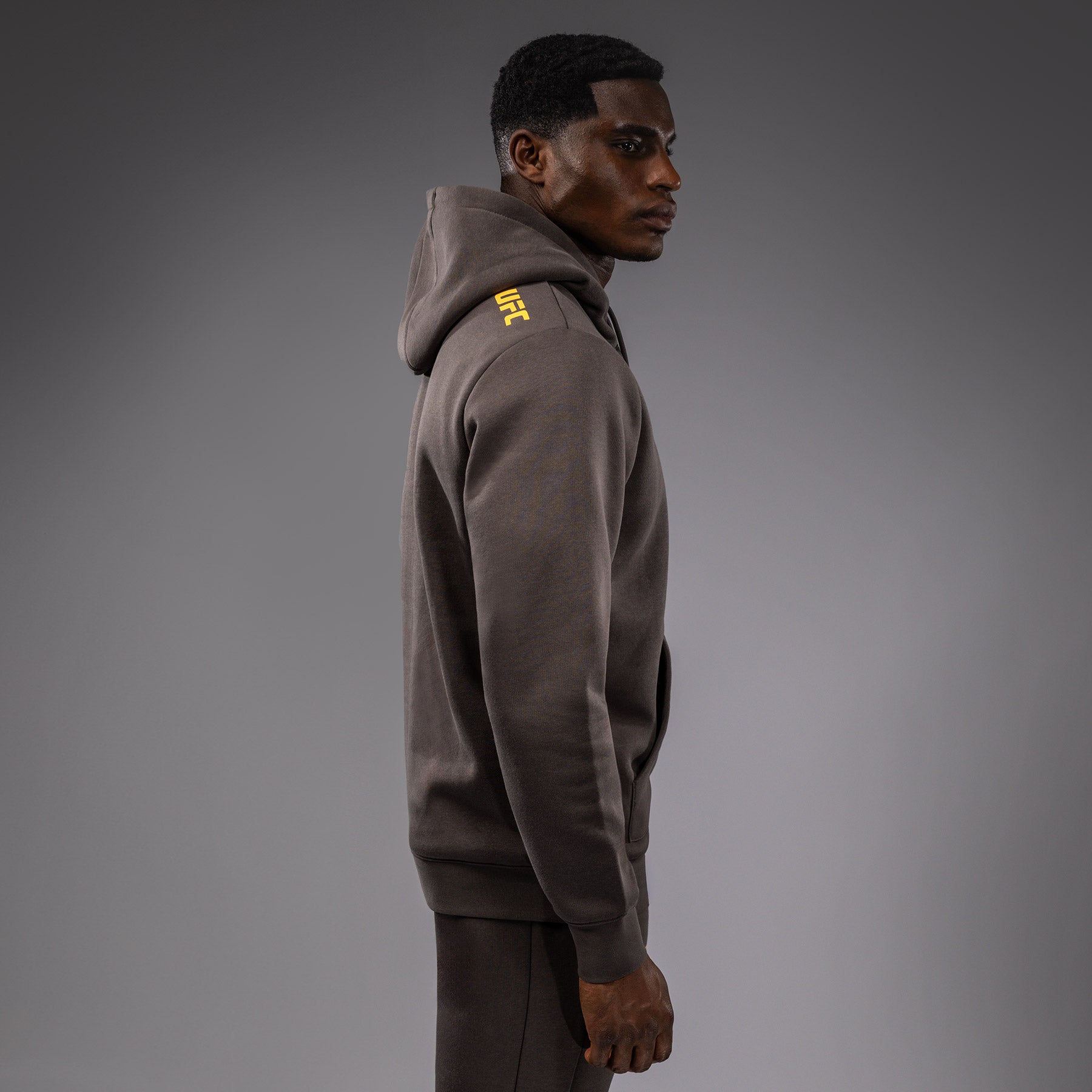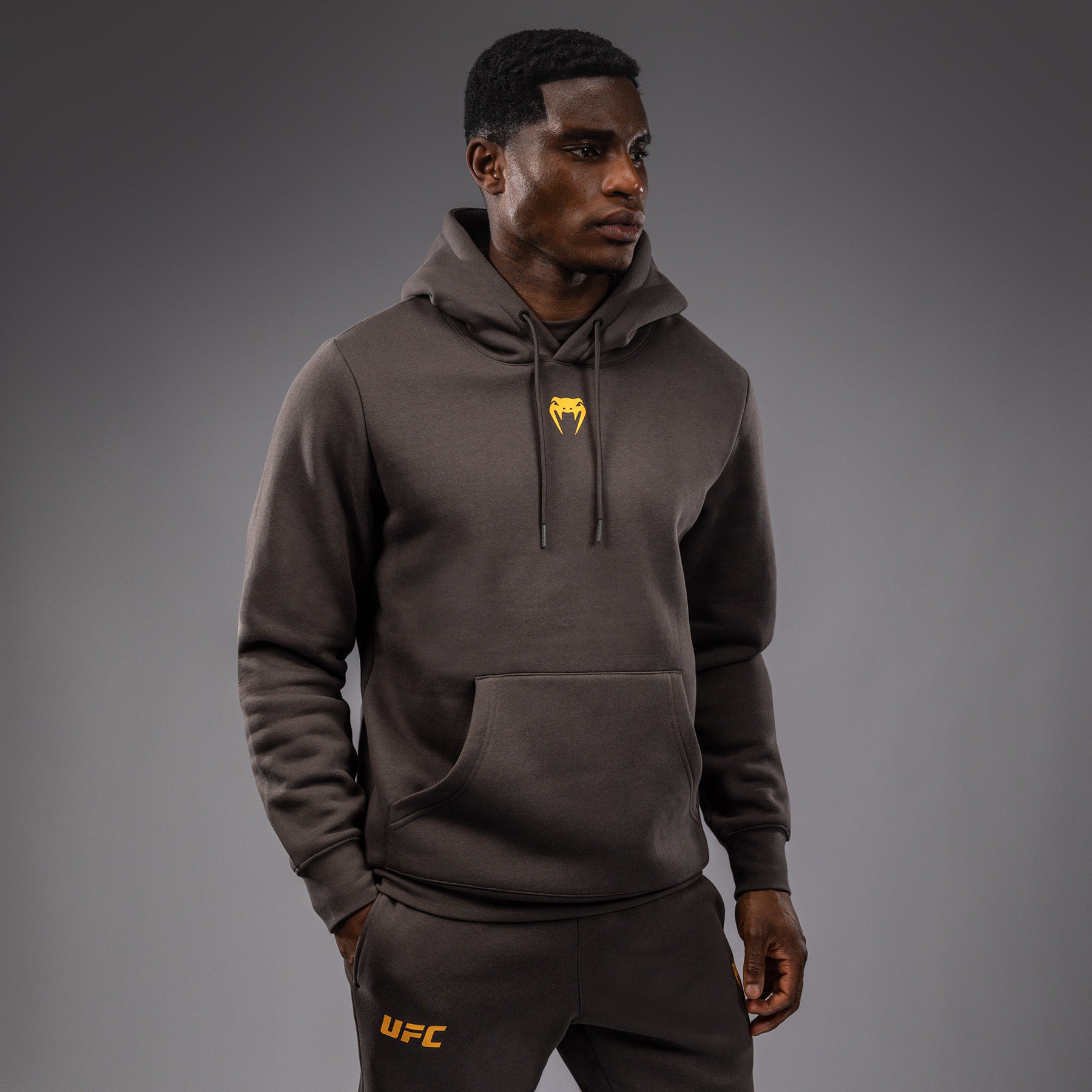 The UFC Fusion by Venum Fight Week Men’s Pullover Hoodie in Earthen Brown features sharp gold branding at the chest, left arm and back of the right shoulder. The kangaroo style front pocket and drawstring hood add finish to this premium hoodie. Pair it with other lifestyle pieces from the same collection.