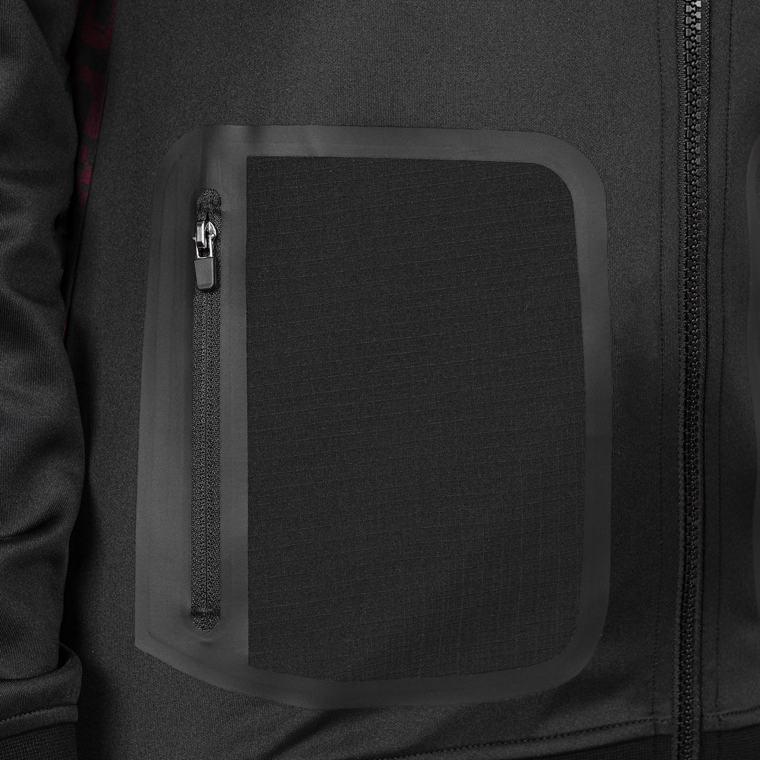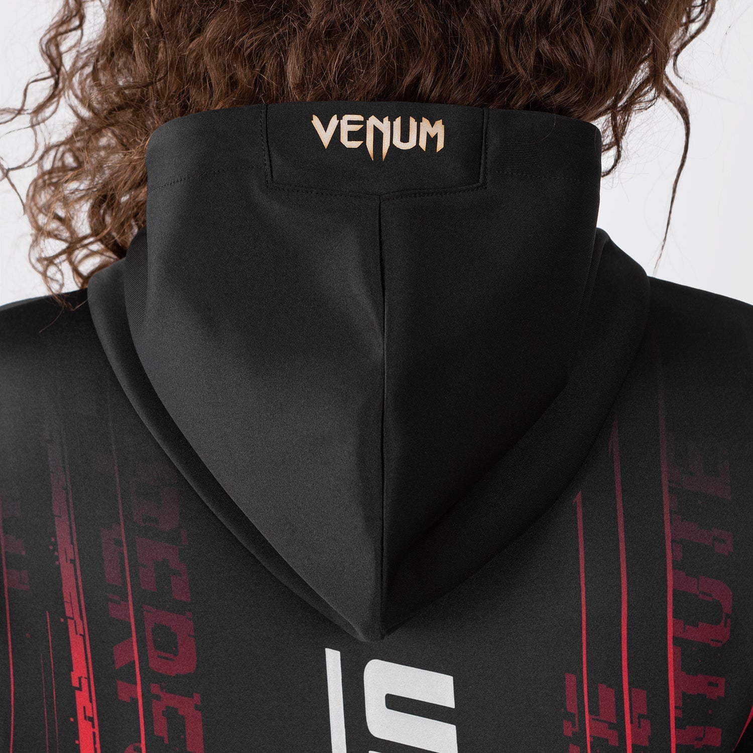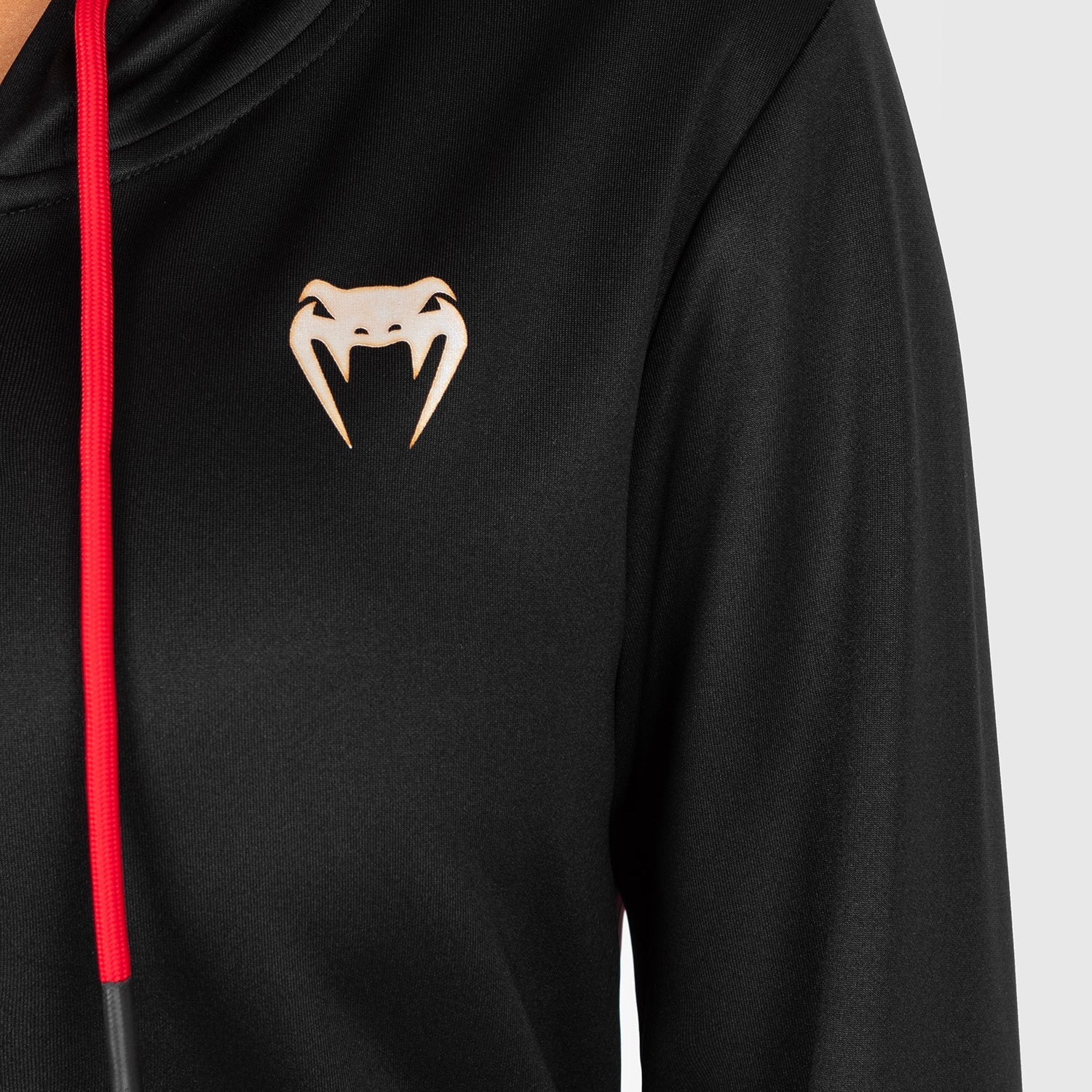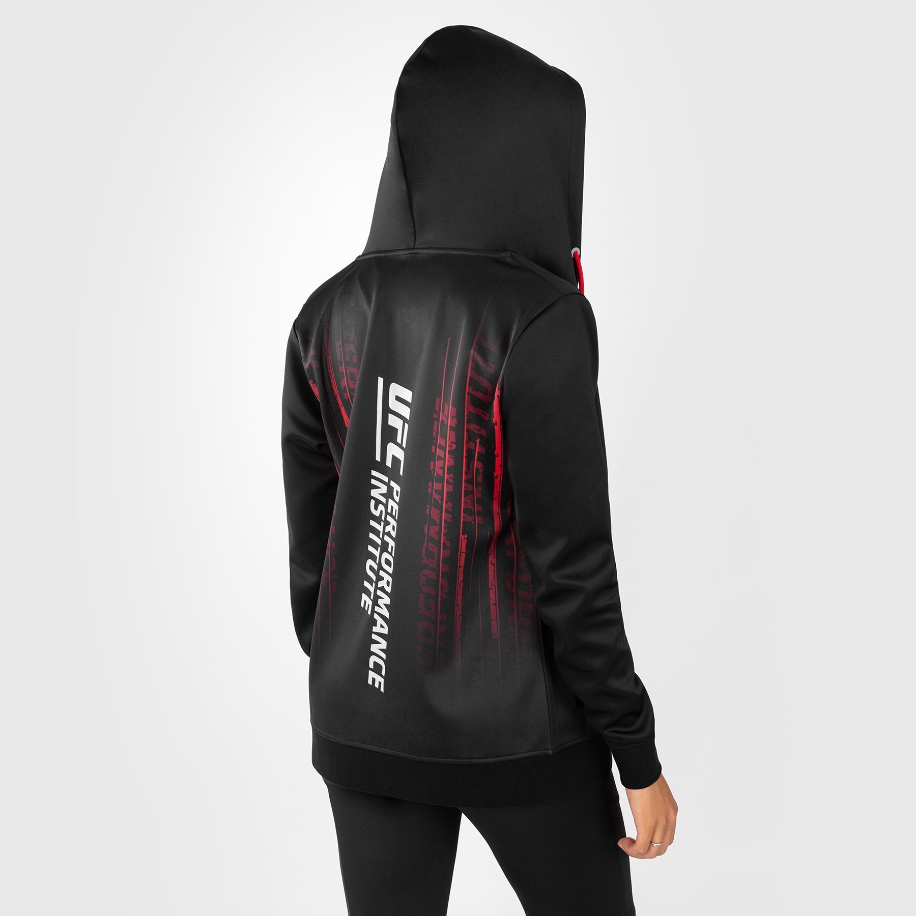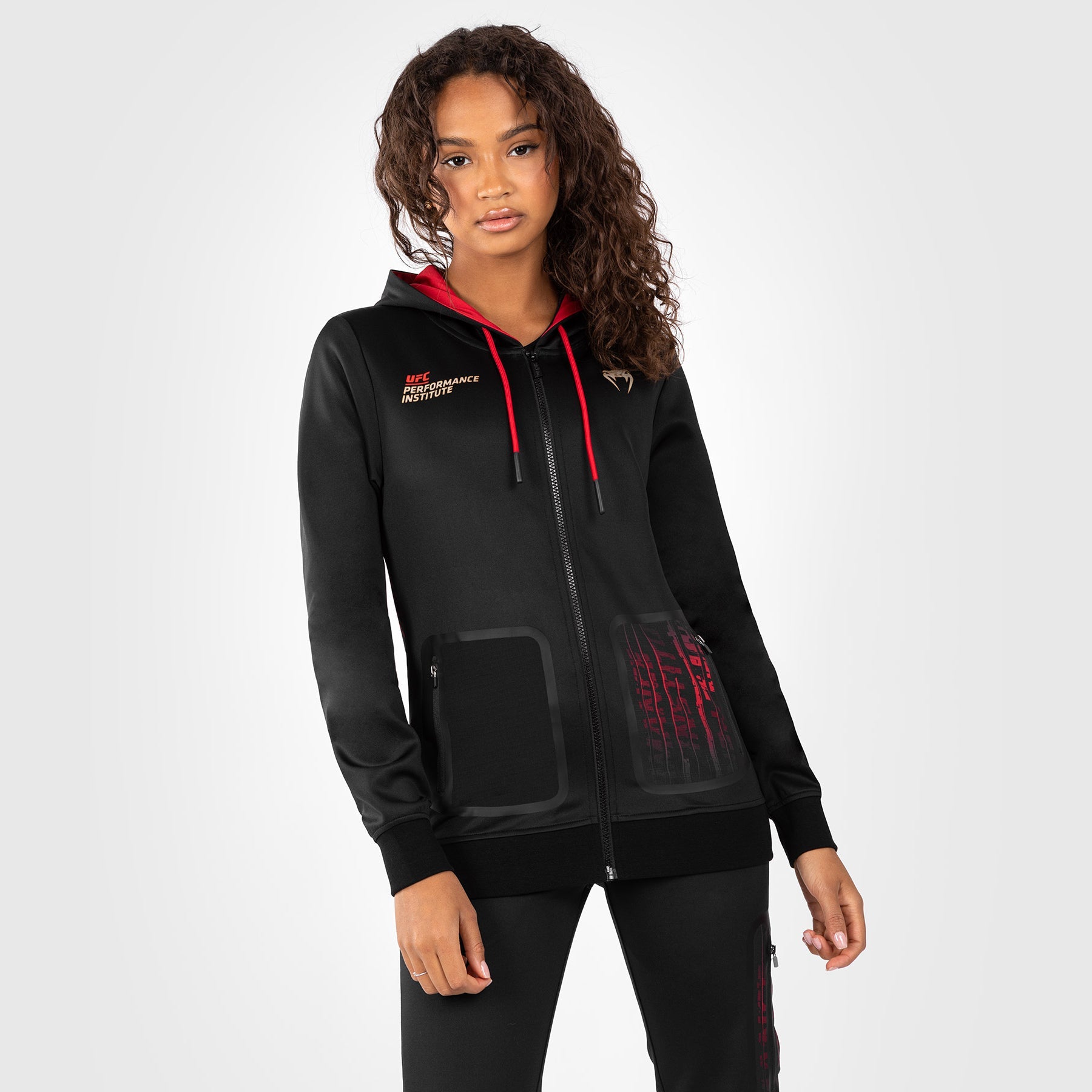 This premium women’s hoodie in black features a contrasting red lining at the hood and a red drawstring. The collection’s dynamic graphic design covers the back of the hoodie and front pocket, with the UFC Performance Institute and Venum logos at the chest.
