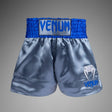 Muay Thai shorts you can turn to again and again: Venum Classic Muay Thai shorts are must-haves for Muay Thai practitioners. Made in Thailand, these Thai boxing shorts have been made with a light and flexible polyester, to leave you free to move. Side slits allow for greater range of motion in the ring. Meanwhile, a wide traditional belt offers a secure supportive fit around the waist, so you can focus on your performance. These Muay Thai Classic shorts in Pebble Grey have a sleek design, with neat finishes and the unmistakable Venum logo at the waist in blue and at the leg in white. Expert Tip: We recommend choosing one size up for a "tailored" fit or two sizes up for a looser fit. Please see the size guide for specific measurements of these authentic Thai made shorts.