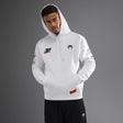 The Venum Motorsport Hoodie in Snow White is a regular fit pullover featuring a kangaroo pocket and drawstring hood. Featuring orange and white printed and embroidered patches inspired by Venum motorsports, this hoodie is track ready!