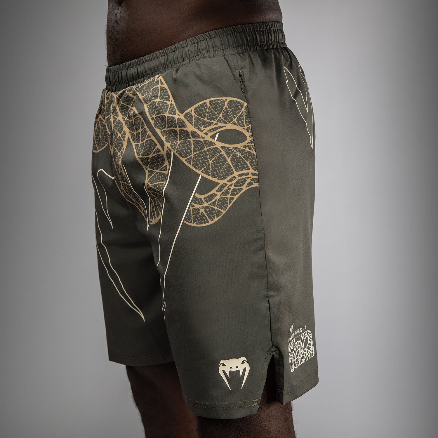 Venum Serpenti: Perform with the silent, relentless force of the snake. This premium collection includes a full range of technical apparel and combat sports equipment. The Venum Serpenti Men’s Training Shorts are a long-length short, designed for cardio, lifting and sparring. The elasticated waistband is supportive, while the flattering loose cut and stretch fabric ensures freedom of movement. Zippered side pockets add to their premium finish.
