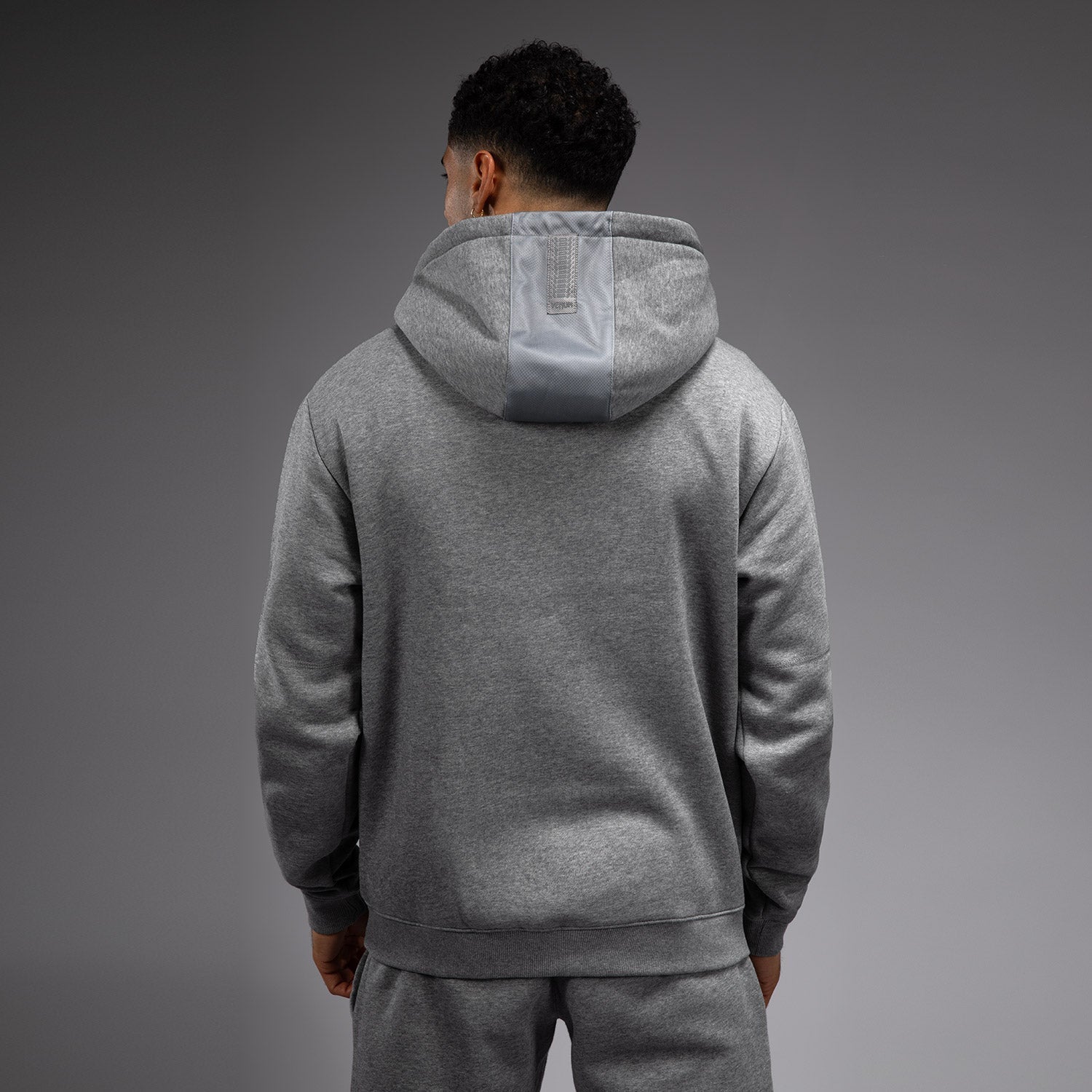 The Silent Power Hoodie in Cloudy Grey features a kangaroo front pocket and drawstring hood. A small embroidered logo sits at the chest, while a branded patch at the hood finishes off the design.