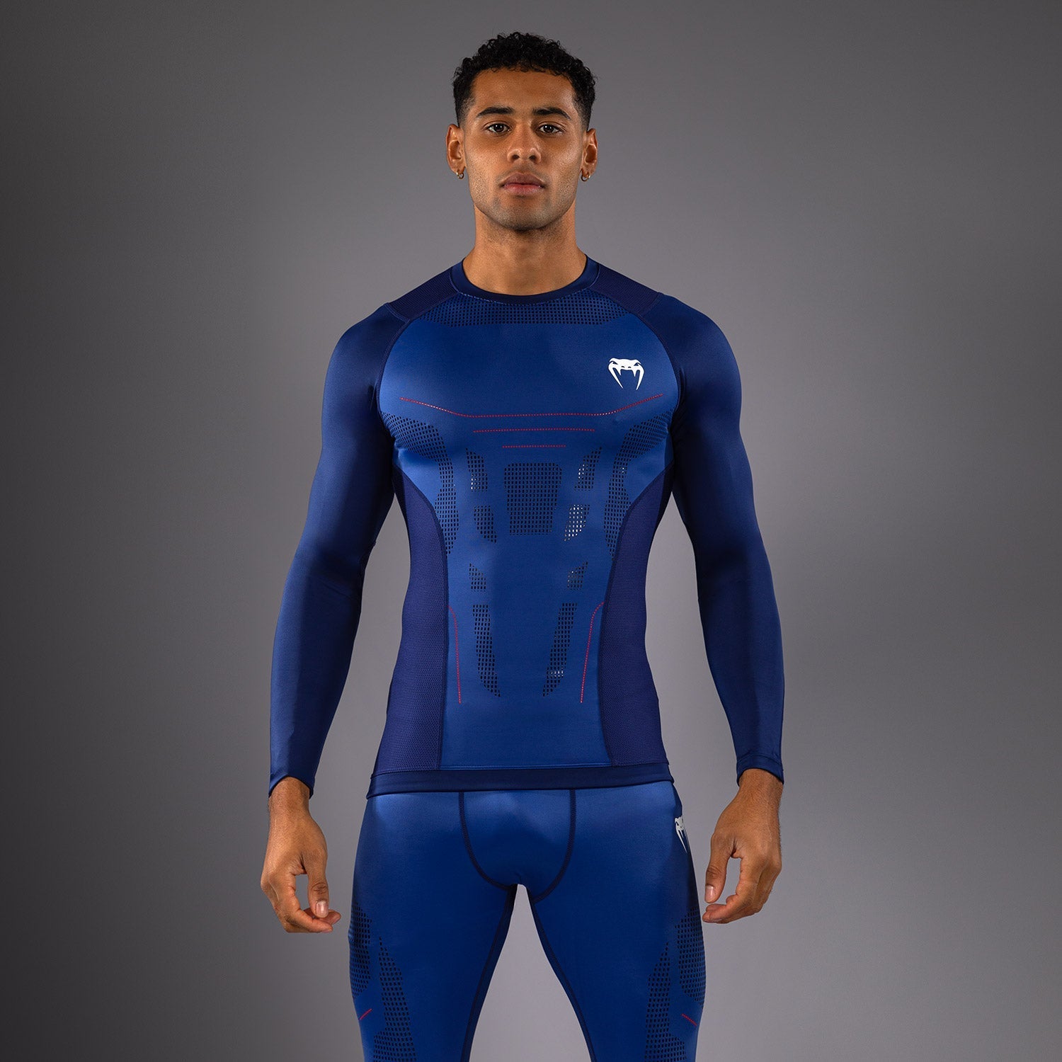 The latest evolution of the Venum Technical range was created with athletes and fighters in mind. Designed for MMA, Brazilian Jiu-Jitsu and other combat sports, this performance range combines sweat-wicking performance fabrics with streamlined graphics and silicone detailing. The Venum Technical 3.0 Long Sleeve Rashguard in Night Blue is a compressive long sleeve rashguard featuring a sleek futuristic design in dark blue and black, with the Venum logo at the chest. The Venum Technical 3.0 Long Sleeve Rashguard is designed to protect from abrasions during floor work in grappling, BJJ and MMA. The compressive body fit provides muscular support and may assist in boosting recovery. This piece pairs perfectly with other items from the Venum Technical 3.0 collection.