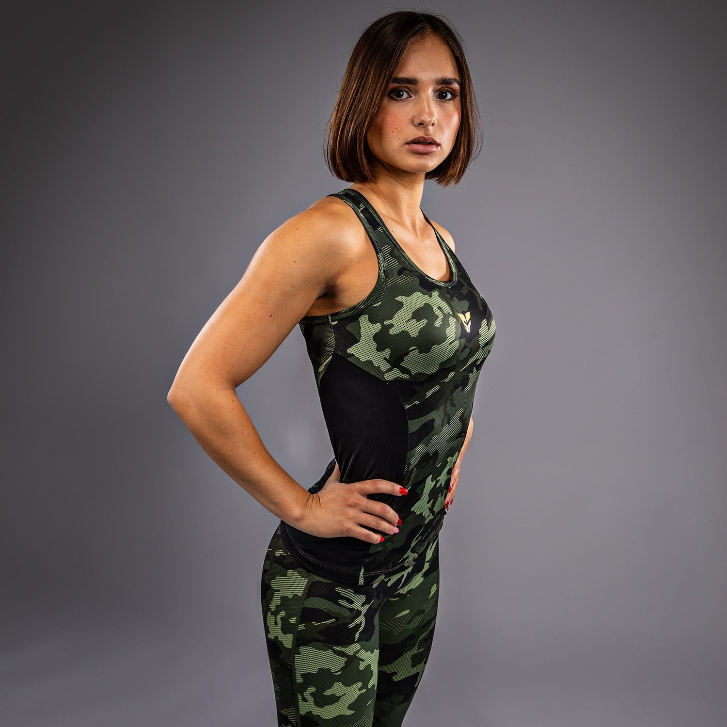Introducing Venum x Sophia Rose. A striking new collection curated by dynamic Venum athlete and fitness trainer, Sophia Rose, designed specifically for the contemporary woman who values the fine blend of functional design and fierce femininity. Bold and unapologetically different, each piece in this distinctive collection reflects Sophia Rose's personal philosophy towards fitness and life— characterized by strength, resilience, confidence, and sheer relentlessness. The Venum x Sophia Rose Women’s Tank Top in Forest Camo is a performance tank designed for combat sports and high intensity training. The dry-tech performance fabric hugs your body while wicking away sweat, so you’ll stay comfortable as your workout heats up. Sublimated camo print brings the badass vibes, while logos in gold add a touch of feminine glamor. Pair this tank with the leggings from the same collection and go crush your next workout, Champ!