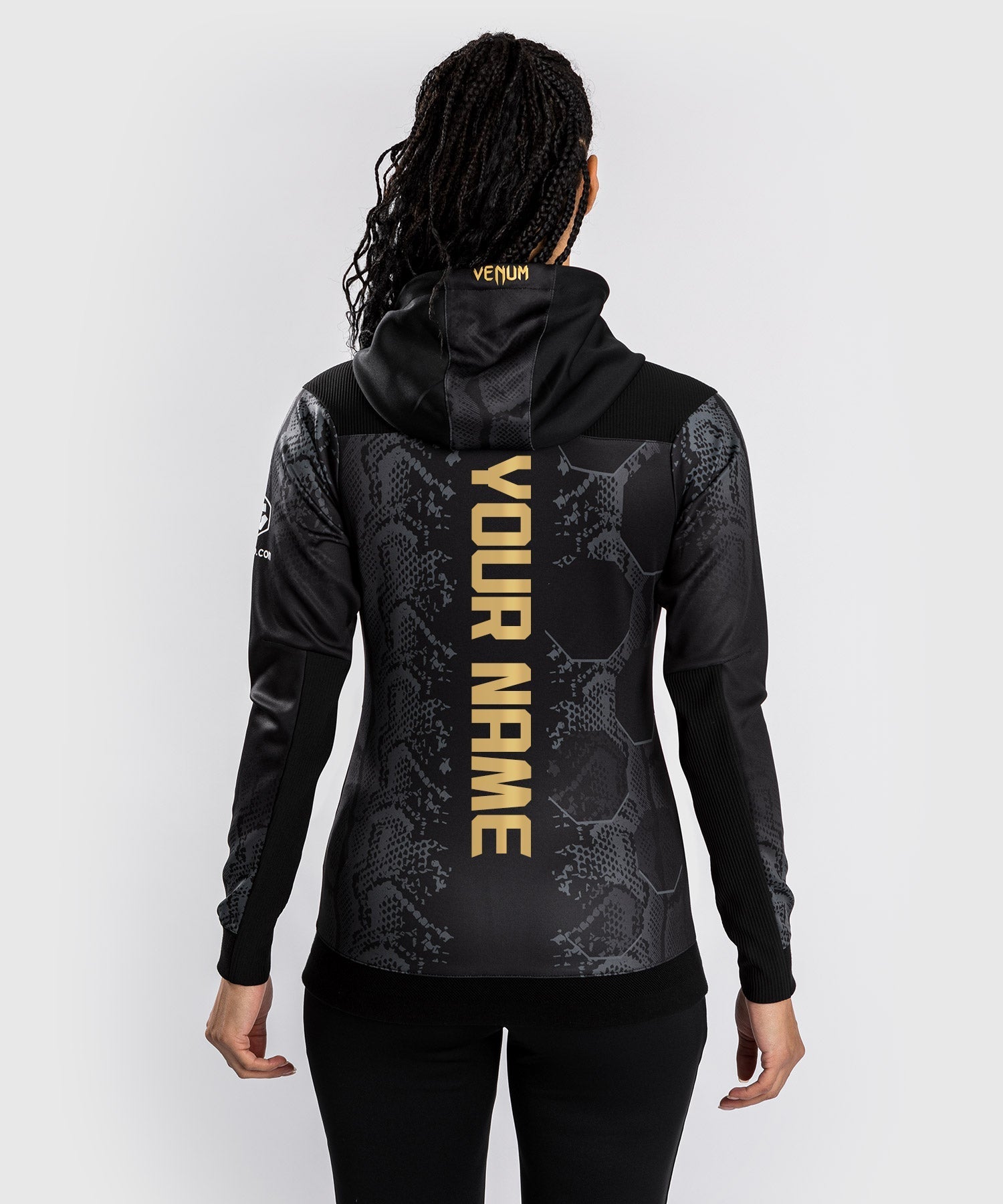 The UFC Adrenaline by Venum Authentic Fight Night Women's Walkout Hoodie features two zippered pockets, plus a mesh-lined hood with adjustable drawstrings. The wrists and inner panel of the arms are made with a premium stretch fabric, to allow fighters to take off their hoodies without taking off their gloves.